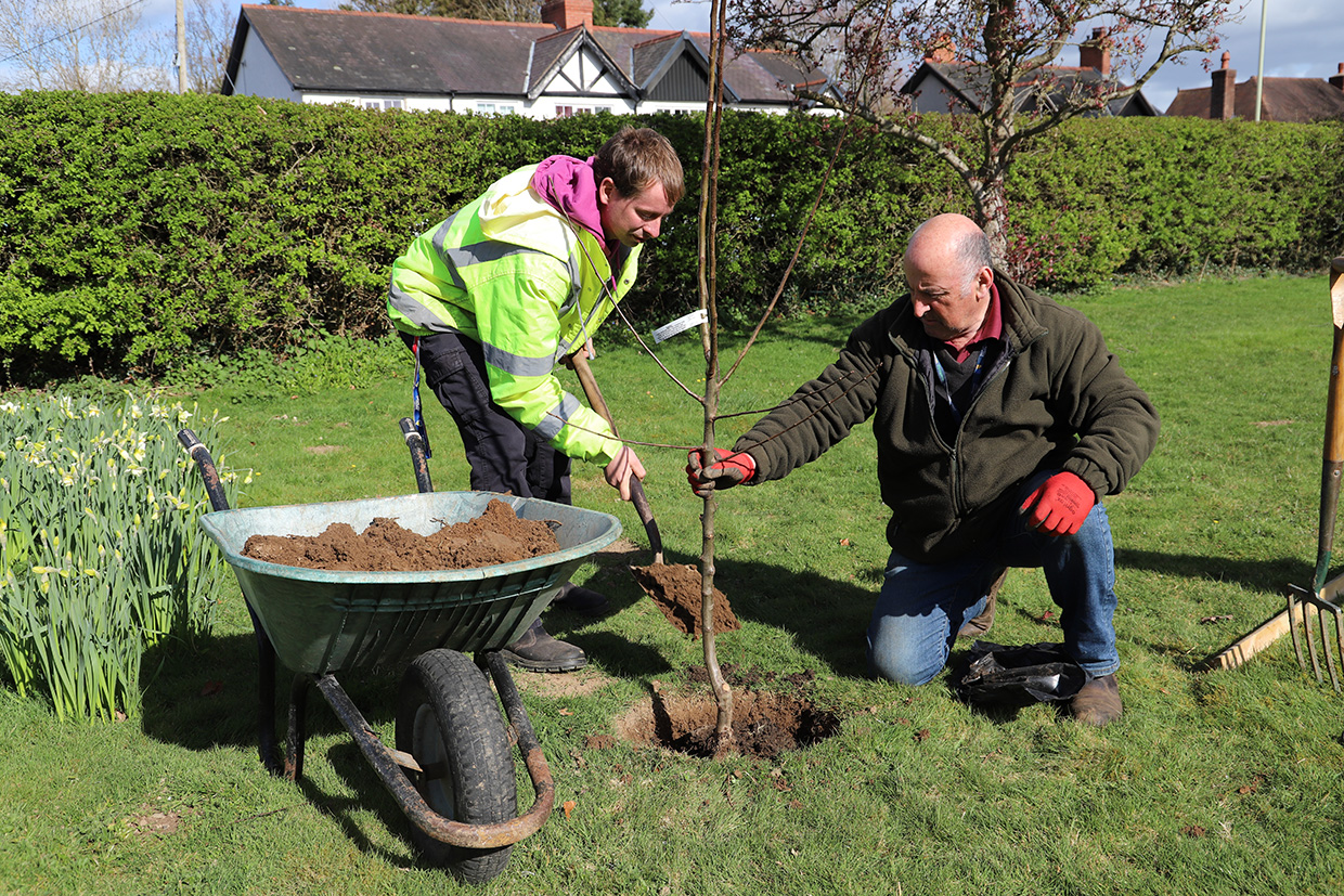 Home News Horticulture team plant mini orchard supported Intern James plants with head gardener Don